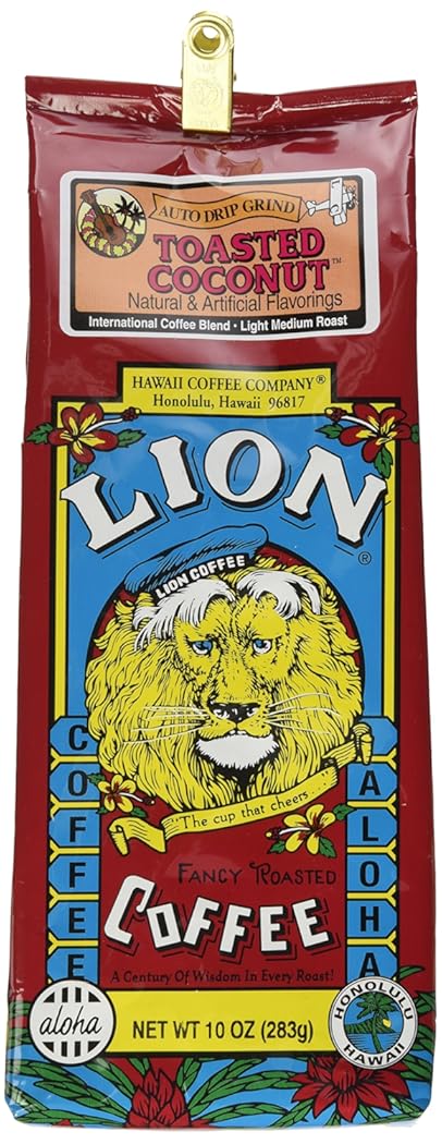 Toasted Coconut Coffee 10 oz grind is best for youSize:10 Ounce LION's Toasted Coconut is an all time favorite flavored coffee. You will find something very enjoyable about the aroma and nutty taste of LION's Toasted Coconut coffee. That satisfying aroma and coconut coffee flavor from lightly roasted coffee beans makes this a very special coconut coffee