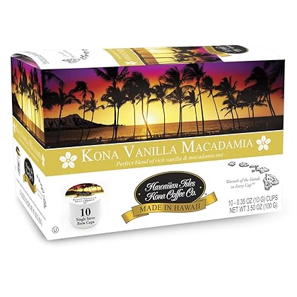 Kona Vanilla Macadamia Nut .35 oz Single Serve Cups is best for youHawaiian Isles Kona Coffee Co. is proud to introduce new single serve coffee cups in our popular Kona Vanilla Macadamia Nut flavor. Coffee lovers can now enjoy the convenience of single cup brewing, along with the wonderful taste of paradise that comes with each cup of Hawaiian Isles Kona Coffee. Our single serve cups are compatible with nearly all Keurig® coffee brewing systems, with the exception of the Vue® model coffee makers. Compatible brewing systems include K-cup® machines.