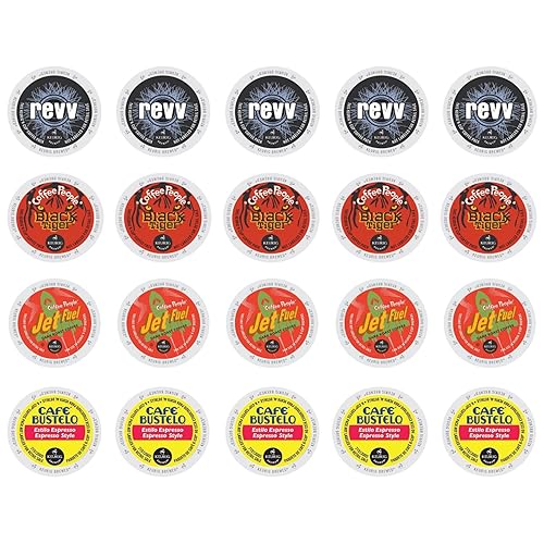 • The High Octane Variety K-cup Sampler Pack for Keurig 2.0 - Café Bustelo Espresso, Revv, Jet Fuel & Black Tiger - 20 Count/4 Varieties is a