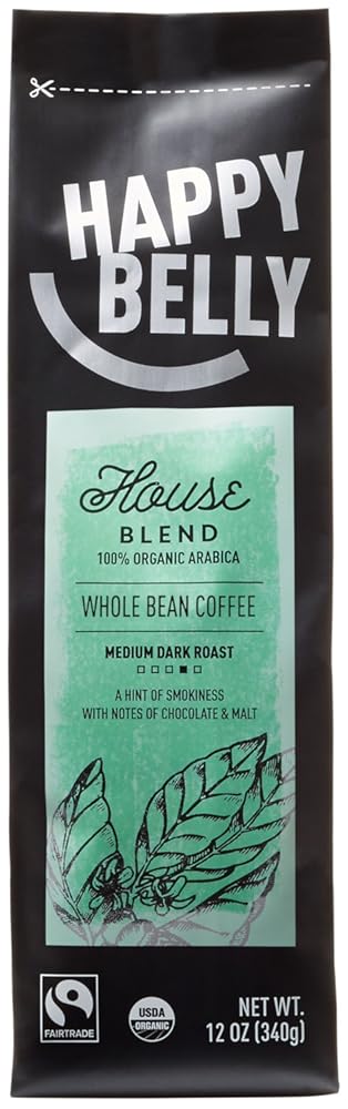 • The Happy Belly House Blend Organic Fairtrade Coffee, Medium Dark Roast, Whole Bean, 12 ounce is a