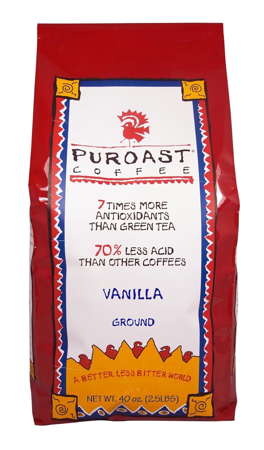 A blend of coffees with a velvety cream and persistent aroma. Aromas of honey and almonds for a mild and creamy espresso. Enjoy this blend as part of your everyday coffee ritual.At Green Mountain Coffee, a 'good' quality coffee just isn't good enough. We travel the globe looking for only the finest beans—the top 10% in the world—and taste them at the source to ensure they meet our standards.Some coffees can set the tone for a quiet moment of reflection. Others are an invitation to enjoy something sweet. No matter how coffee inspires you, we have the perfect varieties to satisfy your every taste, every time.the Puroast Low Acid Coffee Vanilla Flavored Coffee Drip Grind, 2.5-Pound Bag Since 2001, Green Mountain Coffee has become one of the leading roasters of Fair Trade coffee. We're also involved in global and local efforts to continually enhance the living conditions of our growers and their families.Whether you enjoy the brightness of a lighter coffee or favor a more full-bodied brew, we’ve perfected each roast in our extensive collection.From subtle spices to rich desserts, we have an assortment of heartwarming flavors to enjoy in a quiet moment or in the company of friends.Engaging and nuanced, our decaf coffee emphasizes the bean's natural flavor and vibrant aromatics for a well-brewed cup that's right for any occasion.These selections evoke and enhance the best aspects of each season, so you can enjoy your favorite flavors from the heart of the summer to the height of the holiday.Puroast Low Acid Coffee Vanilla Flavored Coffee Drip Grind, 2.5-Pound Bag is best for youFlavor:Drip Grind | Size:2.5 Pound The Puroast story begins while I’m sitting on a Venezuelan coffee farm one morning and I’m served a cup of coffee by my host. The same fellow who grew, roasted and brewed the beans. The taste was unlike any coffee I had ever had. Savory, rich and very smooth. No bitterness. I assumed this great taste was because I was on a coffee farm, like drinking wine in a vineyard. It turns out the secret to this flavor was how heat was used in roasting. I knew then that I wanted to learn how to create a coffee that is pure to the art of roasting. Puroast Coffee. After a long journey, we found the right flavor and Puroast Coffee was born. So my brother and I start selling Puroast in local stores in California, people loved the taste and then we find out there’s a lot more to the story. Mixed in with the compliments about taste, we received comments telling us Puroast Coffee didn’t upset customers’ stomachs or aggravate their heartburn. There were so many of these comments that we decided to find out if there was something different about Puroast which would be a significant benefit. We discovered there was a big difference in Puroast. Not only does our roasting recipe make for a smoother taste, it also greatly reduces the acid in the coffee by more than 70% compared to leading brands. 70% less acid than other coffees! This isn’t just me saying this, it’s Dr. Shibamoto and scientific research team from the University of California/Davis. Dr. Shibamoto found that in reducing acid levels, our roasting process dramatically increased the amount of antioxidants. And by dramatic I mean by 5 times more than other leading coffees and 7 times more than green tea. 7 times more antioxidants than green tea! You will discover what I did on that Venezuelan coffee farm, along with Puroast Coffee’s exquisite flavor, the benefits of lower acid and rich levels of antioxidants will bring you enjoyment like no other coffee you’ve ever had.