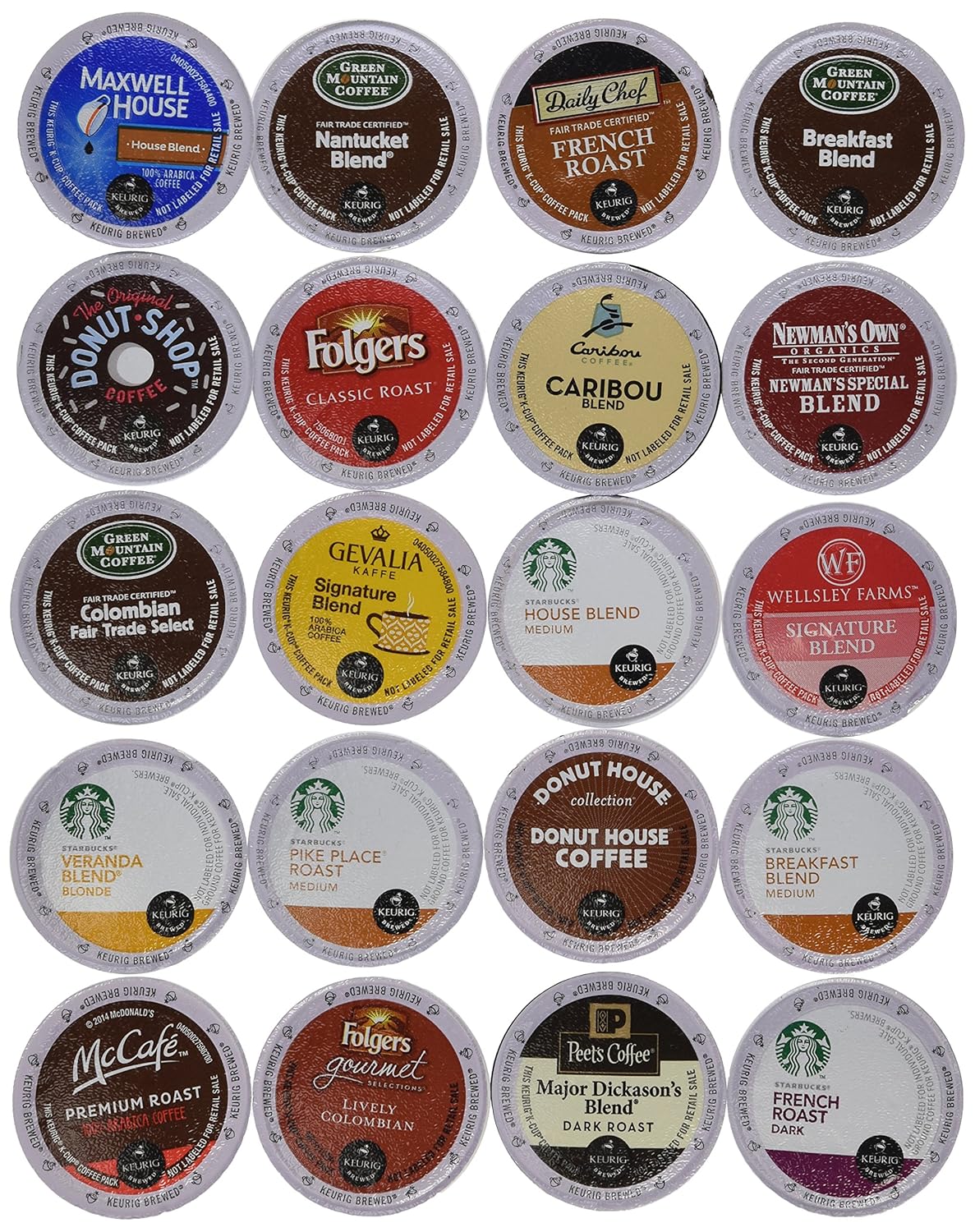 - Largest sampler pack, including cups Authentic Donut Shop, Barnie's Coffee Kitchen, Barrie House, Brown Gold, Cake Boss, Caribou, Caza Trail, Coffee People, Crazy Cups, Diedrich,EkoCups, EkoCups, Emeril's, Green Mountain, Guy Fieri, Hurricane, Marley, Martinsons,Newman' s, Rio Grande Roasters, Second Cup, Tim Horton's, Tullys, Victor Allen's coffee,Barrie House, Caza Trail, Crazy Cups, Crazy Cups, Donut House Collection, EkoCups, Gloria Jeans, Green Mountain, Green Mountain, Victor Allen's coffee, Rio Grande Roasters, Victor Allen's coffee, Martinsons