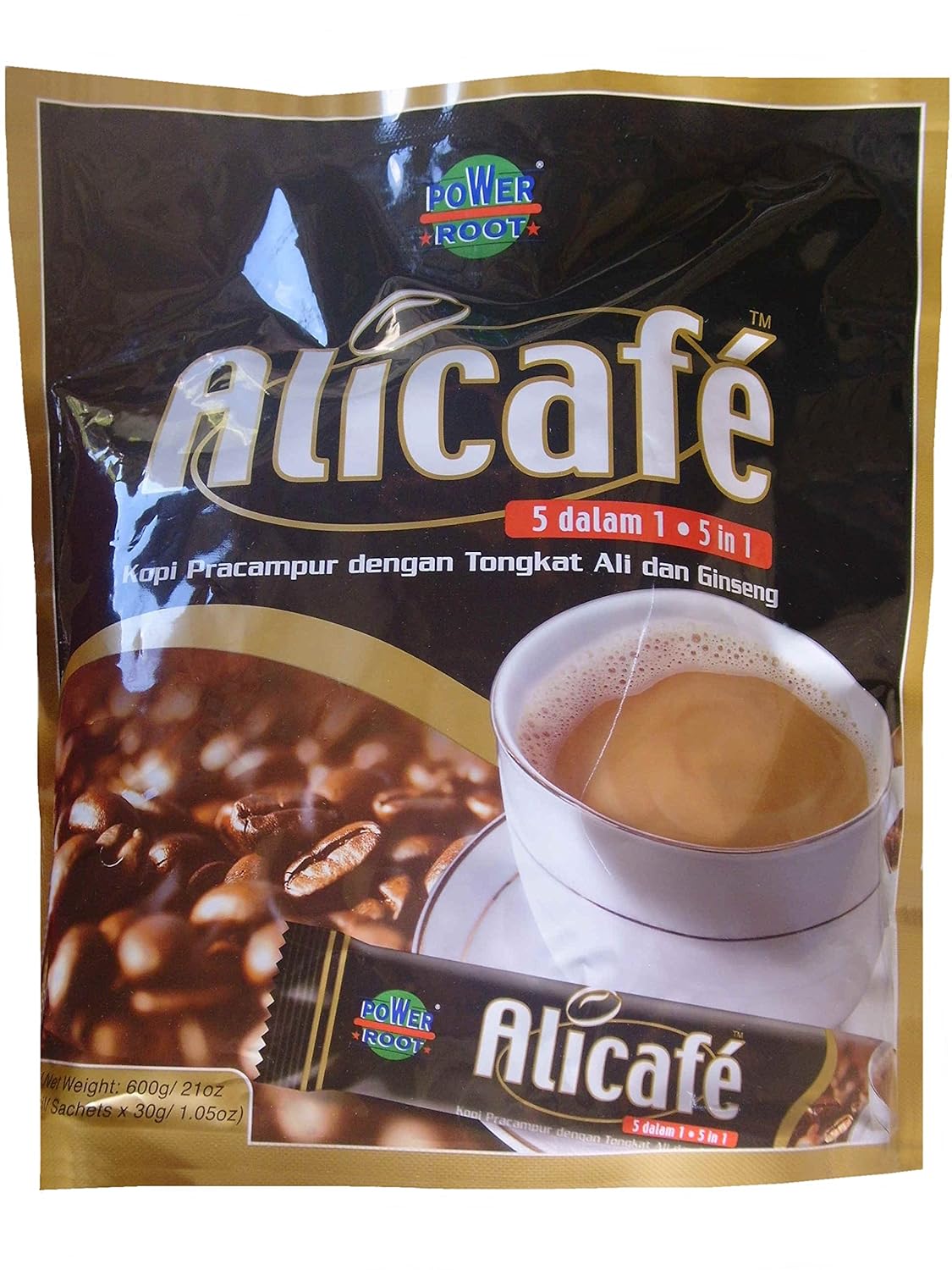 Power Root Alicafe 5 in 1 Instant Premix Coffee Drink With Tongkat Ali & Ginseng, 600 g (30 g × 20 Sachets) is best for youAlicafe Coffee Premix With Tongkat Ali & Ginseng Instant 5 In 1 is Wonderful blend of coffee made from Arabica & Robusta fine coffee beans, combined with quality creamer from Europe for smoothness and heavenly aroma. Contains water soluble Tongkat Ali and Ginseng extracts.