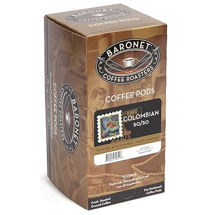 Baronet Coffee 50/50 Regular and Decaf 100% Colombian Coffee Pods, 54 Count is best for youRich, full bodied and excellent flavor that is 50% regular and 50% decaffeinated Colombian coffee, so you don't have to mix it yourself