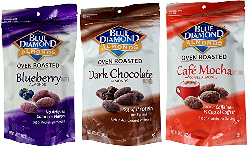 Blue Diamond Almonds VARIETY FLAVORS Blueberry, Dark Chocolate Flavor, Café Mocha Coffee Oven Roasted Almonds (Total of 6 / 5-Ounce Bags) is best for youVariety selection consists of 2 / 5-ounce bags EACH of Diamond Blueberry Oven Roasted Almonds, Blue Diamond Dark Chocolate Oven Roasted Almonds, and Blue Diamond Café Mocha Oven Roasted Almonds.