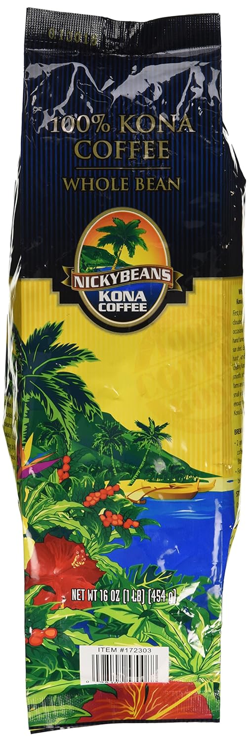 100% Kona Coffee Whole Bean Nicky Beans 1 Pound is best for you100% Pure Kona Coffee - Dark Roast - 1lb. Bag - Whole Bean100% pure Kona Coffee. If you want experience all the natural flavors and complexity of real Hawaiian Kona Coffee then enjoy our award winning 100% Kona Coffee!100% Kona coffee is regarded worldwide as a classic coffee. Pure Kona beans are grown by hundreds of passionate small farmers, on holdings averaging less than three acres, near the town of Kona on the Big Island of Hawaii.Pure Kona coffee beans are produced exclusively from trees of a traditional strain of Typica, one of the world's oldest coffee varieties. The 100% pure Kona coffee beans we sell are selectively hand-picked, usually by the farmers themselves, to make great Kona coffees. These premium 100% Kona coffee beans are wet-processed using the traditional ferment-and-wash method. The fundamental Kona coffee cup reflects this attention to detail. Pure Kona beans yield a drink with gentle, lively acidity and high-toned, clean complexity.