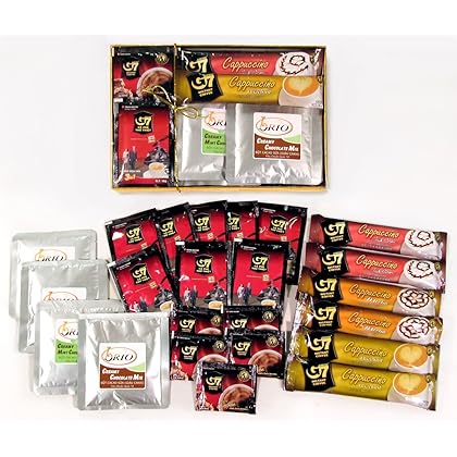 G7 Instant Coffee Entertainer Selection is best for youThis is our best selling selection of popular G7 and Brio products. It contains G7 Black instant coffee, the industry standard for dry-process full flavored instant coffee (not freeze-dried!), G7 3-in-1 (mix of coffee, creamer and sugar), G7 Cappuccinos (Mocha and Hazelnut). Also includes 2 Brio Hot Chocolate mix and Mint Hot chocolate. Brio is so rich it never needs added milk, just hot water. Perfect for making gourmet coffee and chocolate drinks on a moment;s notice or to bring as a hostess gift.