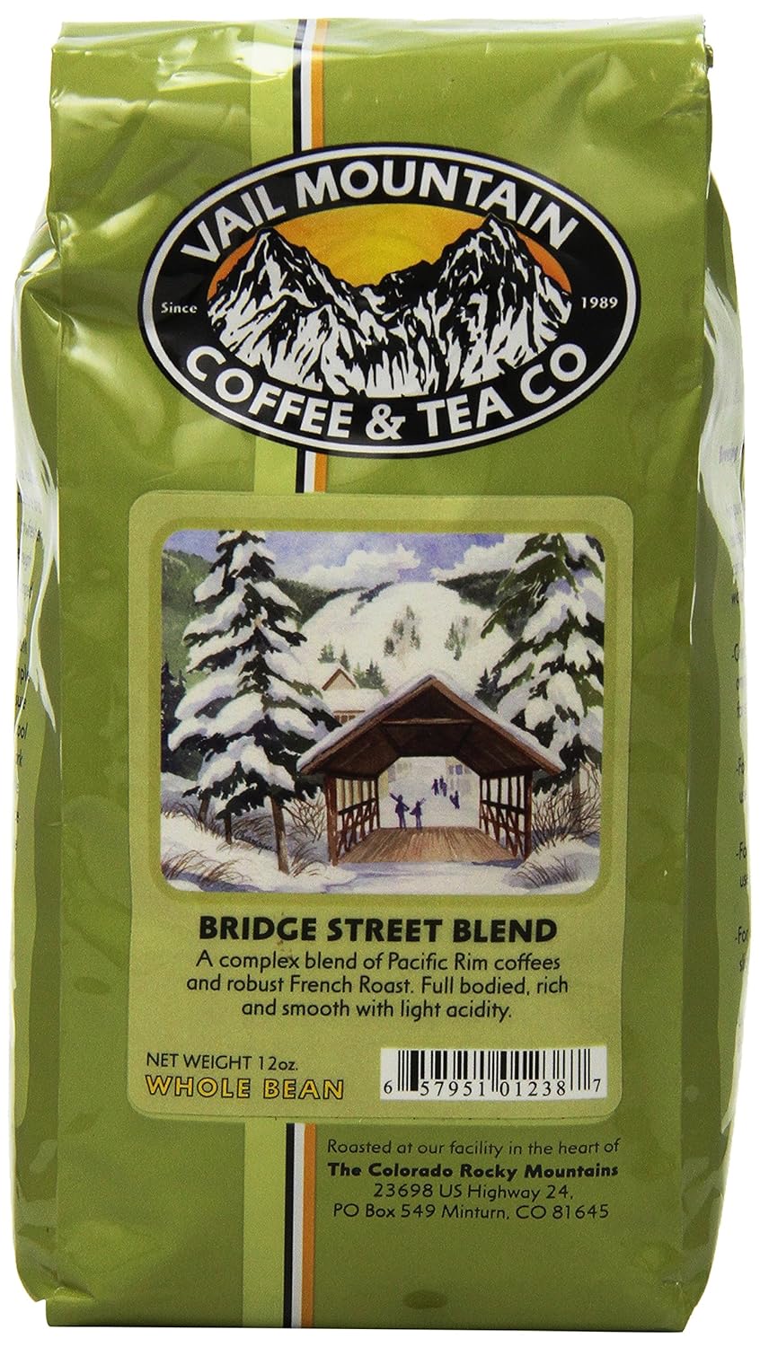 Vail Mountain Coffee & Tea Bridge Street Blend Whole Bean Coffee, 12-Ounce Bags (Pack of 3) is best for youA complex blend of Pacific Rim coffees and robust French roast. Full-bodied, rich and smooth with light acidity.